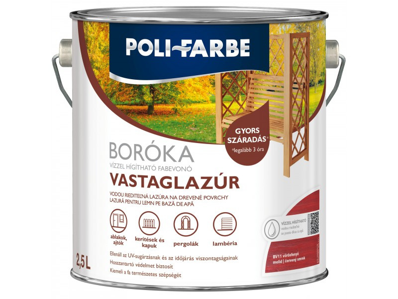 Vízzel hígítható vastaglazúr. Bevonata dekoratív, fényes, az időjárásnak, az UV-sugárzásnak kiválóan ellenáll. A fa természetes légzését nem gátolja, szerkezetét nem fedi el, tartós védelmet biztosít. Kültéren a fa megfelelő védelmét első rétegben Poli-Farbe Boróka Primer fakonzerváló alapozó használata biztosítja.