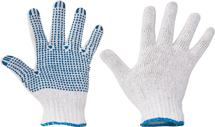 Kötött, varratmentes nylon kesztyű PVC-vel pontozott tenyérrel és ujjakkal, valamint rugalmas kötött mandzsettával.