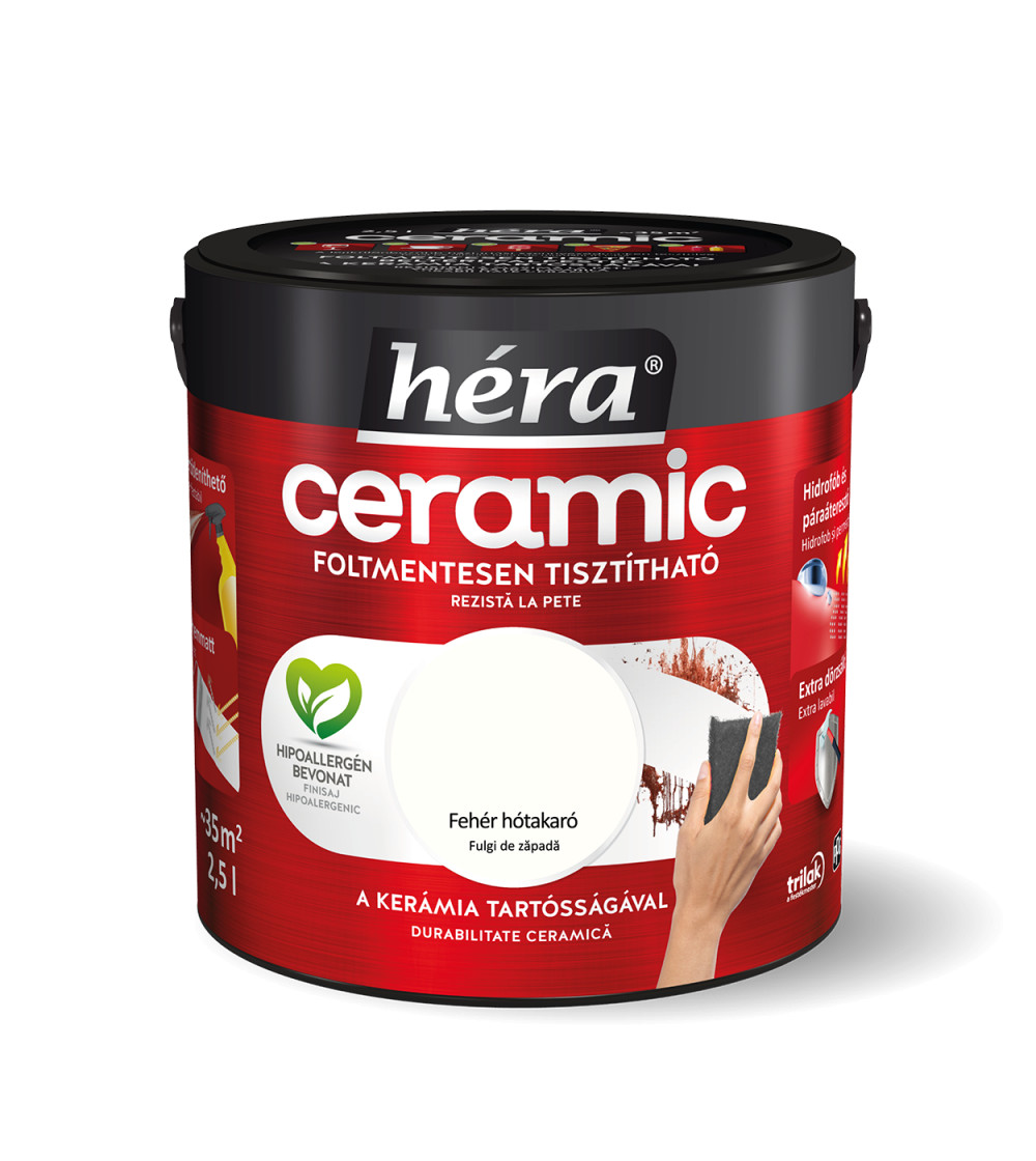 A Héra Ceramic speciális mikrokerámia-gyöngy tartalmának köszönhetően a legellenállóbb Héra beltéri falfesték. A kerámia technológia kimagasló mosás- és dörzsállóságot biztosít a felületnek, így téve azt foltmentesen tisztíthatóvá és fertőtleníthetővé. A Héra Ceramic falfesték hidrofób alkotórészei révén vízlepergető bevonatot képez, miközben innovatív kötőanyag szerkezete kiváló páraáteresztő tulajdonságot biztosít. A hipoallergén, selyemmatt felület exkluzív színmegjelenést kölcsönöz otthonának.