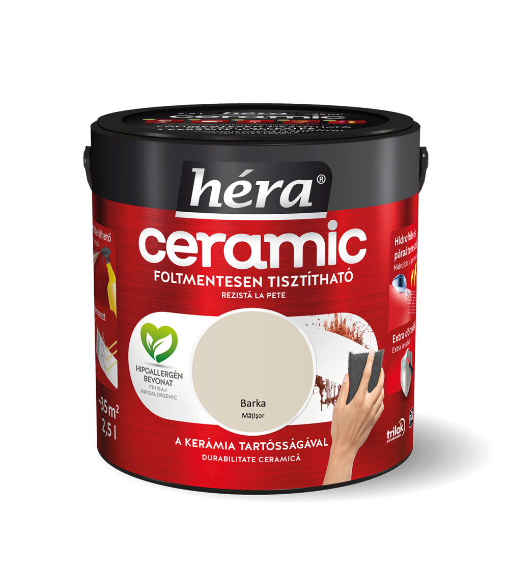 A Héra Ceramic speciális mikrokerámia-gyöngy tartalmának köszönhetően a legellenállóbb Héra beltéri falfesték. A kerámia technológia kimagasló mosás- és dörzsállóságot biztosít a felületnek, így téve azt foltmentesen tisztíthatóvá és fertőtleníthetővé. A Héra Ceramic falfesték hidrofób alkotórészei révén vízlepergető bevonatot képez, miközben innovatív kötőanyag szerkezete kiváló páraáteresztő tulajdonságot biztosít. A hipoallergén, selyemmatt felület exkluzív színmegjelenést kölcsönöz otthonának.
