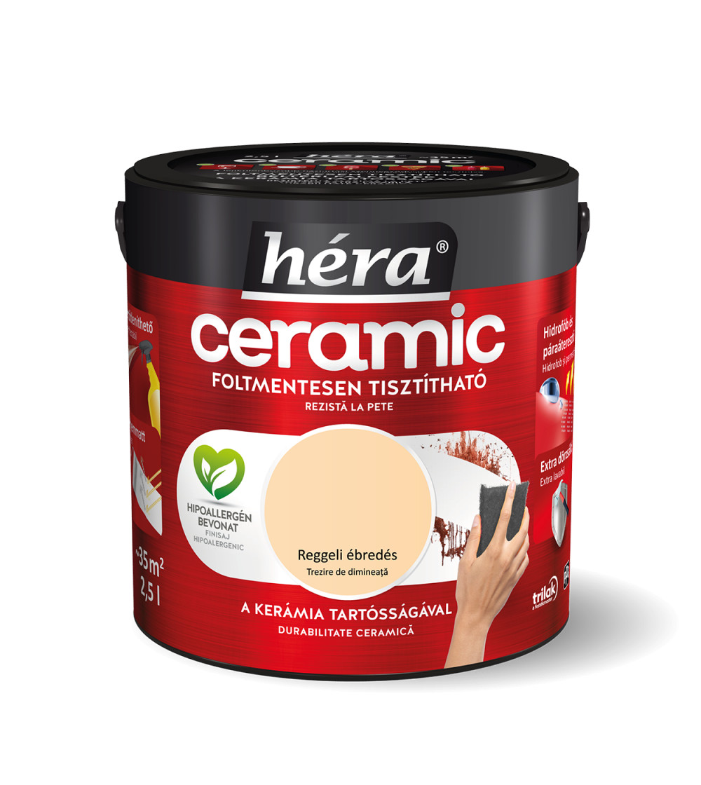 A Héra Ceramic speciális mikrokerámia-gyöngy tartalmának köszönhetően a legellenállóbb Héra beltéri falfesték. A kerámia technológia kimagasló mosás- és dörzsállóságot biztosít a felületnek, így téve azt foltmentesen tisztíthatóvá és fertőtleníthetővé. A Héra Ceramic falfesték hidrofób alkotórészei révén vízlepergető bevonatot képez, miközben innovatív kötőanyag szerkezete kiváló páraáteresztő tulajdonságot biztosít. A hipoallergén, selyemmatt felület exkluzív színmegjelenést kölcsönöz otthonának.