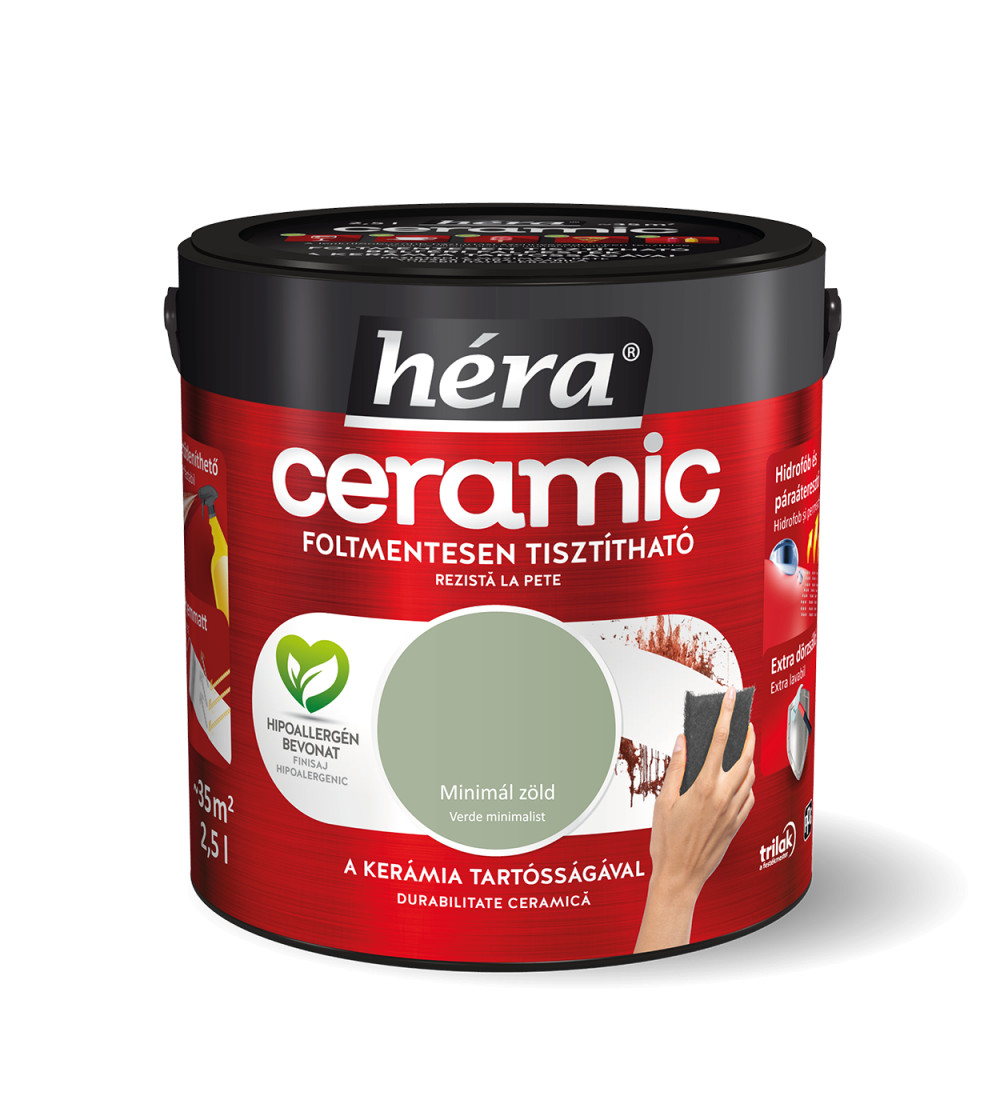 A Héra Ceramic speciális mikrokerámia-gyöngy tartalmának köszönhetően a legellenállóbb Héra beltéri falfesték. A kerámia technológia kimagasló mosás- és dörzsállóságot biztosít a felületnek, így téve azt foltmentesen tisztíthatóvá és fertőtleníthetővé. A Héra Ceramic falfesték hidrofób alkotórészei révén vízlepergető bevonatot képez, miközben innovatív kötőanyag szerkezete kiváló páraáteresztő tulajdonságot biztosít. A hipoallergén, selyemmatt felület exkluzív színmegjelenést kölcsönöz otthonának.