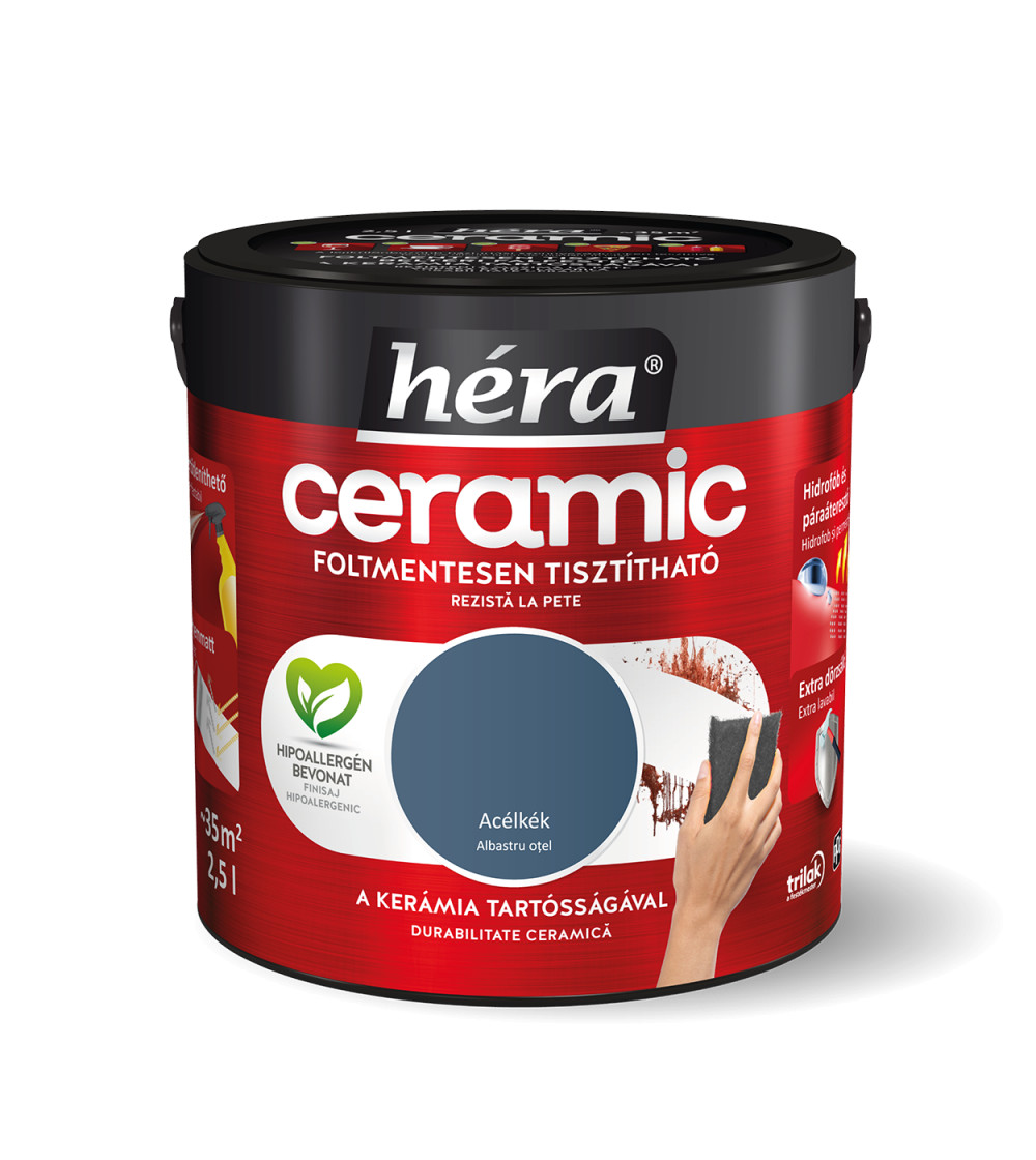A Héra Ceramic speciális mikrokerámia-gyöngy tartalmának köszönhetően a legellenállóbb Héra beltéri falfesték. A kerámia technológia kimagasló mosás- és dörzsállóságot biztosít a felületnek, így téve azt foltmentesen tisztíthatóvá és fertőtleníthetővé. A Héra Ceramic falfesték hidrofób alkotórészei révén vízlepergető bevonatot képez, miközben innovatív kötőanyag szerkezete kiváló páraáteresztő tulajdonságot biztosít. A hipoallergén, selyemmatt felület exkluzív színmegjelenést kölcsönöz otthonának.