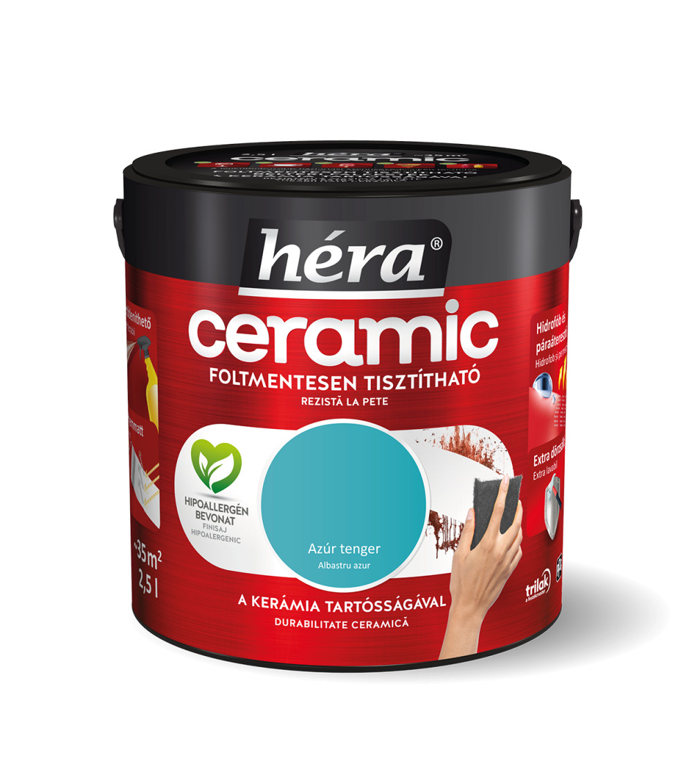 A Héra Ceramic speciális mikrokerámia-gyöngy tartalmának köszönhetően a legellenállóbb Héra beltéri falfesték. A kerámia technológia kimagasló mosás- és dörzsállóságot biztosít a felületnek, így téve azt foltmentesen tisztíthatóvá és fertőtleníthetővé. A Héra Ceramic falfesték hidrofób alkotórészei révén vízlepergető bevonatot képez, miközben innovatív kötőanyag szerkezete kiváló páraáteresztő tulajdonságot biztosít. A hipoallergén, selyemmatt felület exkluzív színmegjelenést kölcsönöz otthonának.