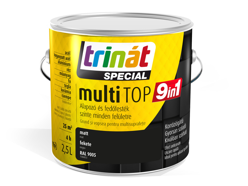 A Trinát Multitop 9in1 zománcfesték gyorsan száradó, kiválóan szórható korróziógátló alapozó és fedőfesték szinte minden felületre. Legyen szó akár beltéri vagy kültéri festésről, rengeteg különböző felületen könnyedén megtapad és hosszútávú védelmet biztosít.