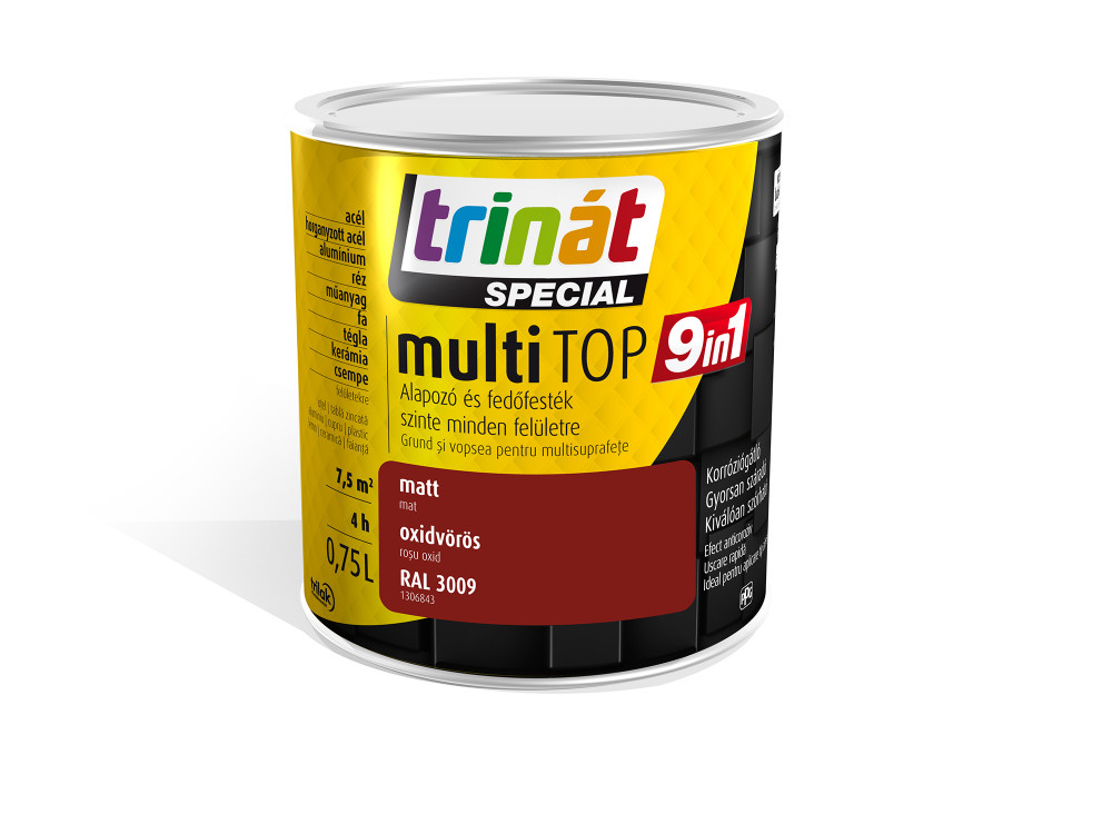 A Trinát Multitop 9in1 zománcfesték gyorsan száradó, kiválóan szórható korróziógátló alapozó és fedőfesték szinte minden felületre. Legyen szó akár beltéri vagy kültéri festésről, rengeteg különböző felületen könnyedén megtapad és hosszútávú védelmet biztosít.