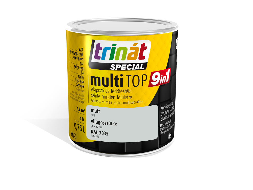 A Trinát Multitop 9in1 zománcfesték gyorsan száradó, kiválóan szórható korróziógátló alapozó és fedőfesték szinte minden felületre. Legyen szó akár beltéri vagy kültéri festésről, rengeteg különböző felületen könnyedén megtapad és hosszútávú védelmet biztosít.