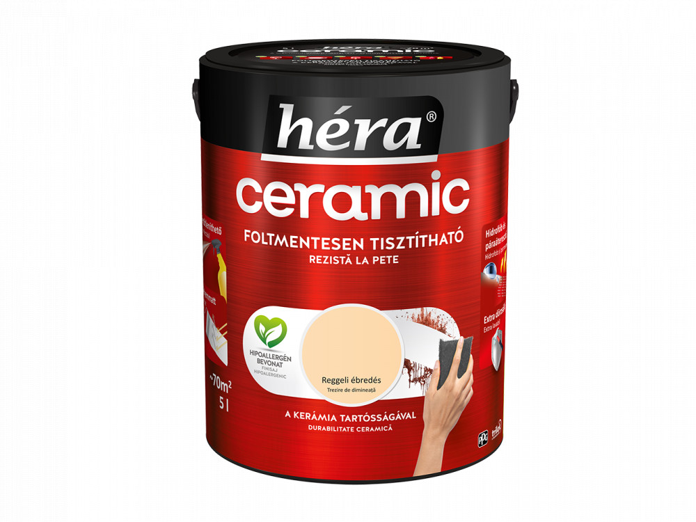 A Héra Ceramic speciális mikrokerámia-gyöngy tartalmának köszönhetően a legellenállóbb Héra beltéri falfesték. A kerámia technológia kimagasló mosás- és dörzsállóságot biztosít a felületnek, így téve azt foltmentesen tisztíthatóvá és fertőtleníthetővé. A Héra Ceramic falfesték hidrofób alkotórészei révén vízlepergető bevonatot képez, miközben innovatív kötőanyag szerkezete kiváló páraáteresztő tulajdonságot biztosít. A hipoallergén, selyemmatt felület exkluzív színmegjelenést kölcsönöz otthonának.