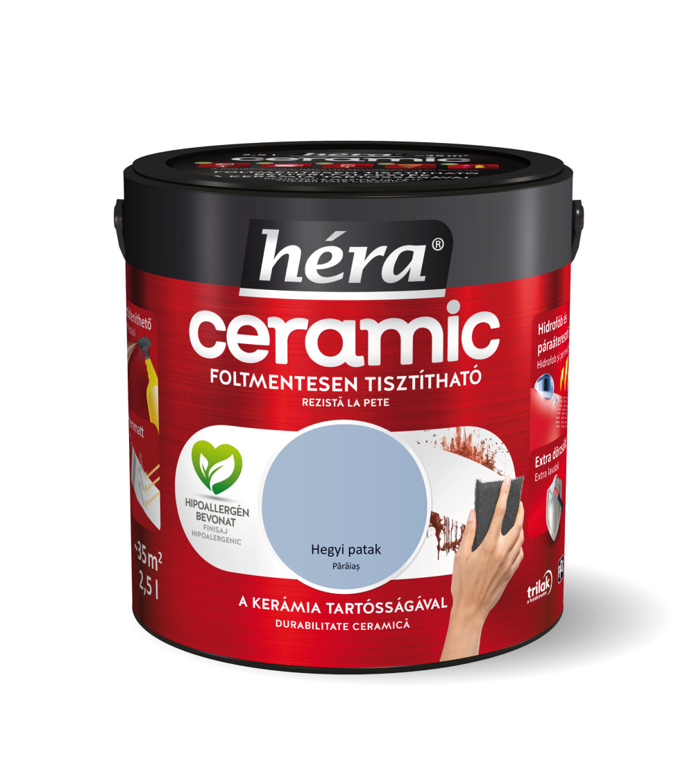 A Héra Ceramic speciális mikrokerámia-gyöngy tartalmának köszönhetően a legellenállóbb Héra beltéri falfesték. A kerámia technológia kimagasló mosás- és dörzsállóságot biztosít a felületnek, így téve azt foltmentesen tisztíthatóvá és fertőtleníthetővé. A Héra Ceramic falfesték hidrofób alkotórészei révén vízlepergető bevonatot képez, miközben innovatív kötőanyag szerkezete kiváló páraáteresztő tulajdonságot biztosít. A hipoallergén, selyemmatt felület exkluzív színmegjelenést kölcsönöz otthonának.