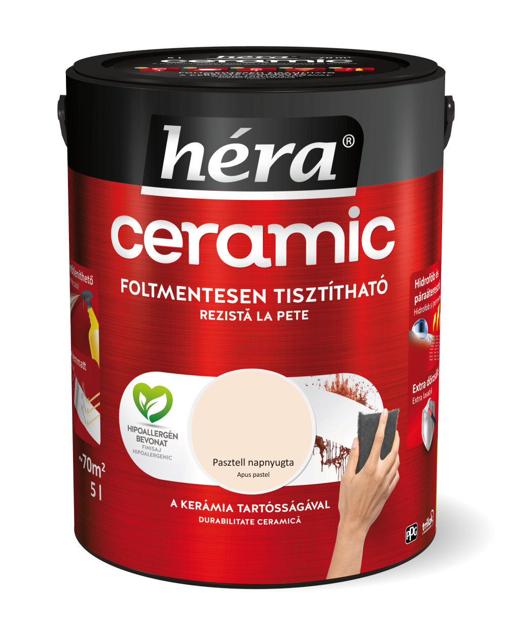 A Héra Ceramic speciális mikrokerámia-gyöngy tartalmának köszönhetően a legellenállóbb Héra beltéri falfesték. A kerámia technológia kimagasló mosás- és dörzsállóságot biztosít a felületnek, így téve azt foltmentesen tisztíthatóvá és fertőtleníthetővé. A Héra Ceramic falfesték hidrofób alkotórészei révén vízlepergető bevonatot képez, miközben innovatív kötőanyag szerkezete kiváló páraáteresztő tulajdonságot biztosít. A hipoallergén, selyemmatt felület exkluzív színmegjelenést kölcsönöz otthonának.