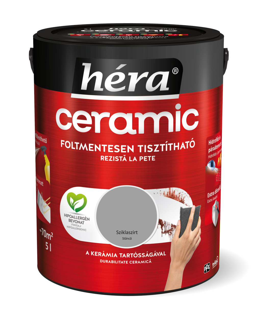 A Héra Ceramic speciális mikrokerámia-gyöngy tartalmának köszönhetően a legellenállóbb Héra beltéri falfesték. A kerámia technológia kimagasló mosás- és dörzsállóságot biztosít a felületnek, így téve azt foltmentesen tisztíthatóvá és fertőtleníthetővé. A Héra Ceramic falfesték hidrofób alkotórészei révén vízlepergető bevonatot képez, miközben innovatív kötőanyag szerkezete kiváló páraáteresztő tulajdonságot biztosít. A hipoallergén, selyemmatt felület exkluzív színmegjelenést kölcsönöz otthonának.