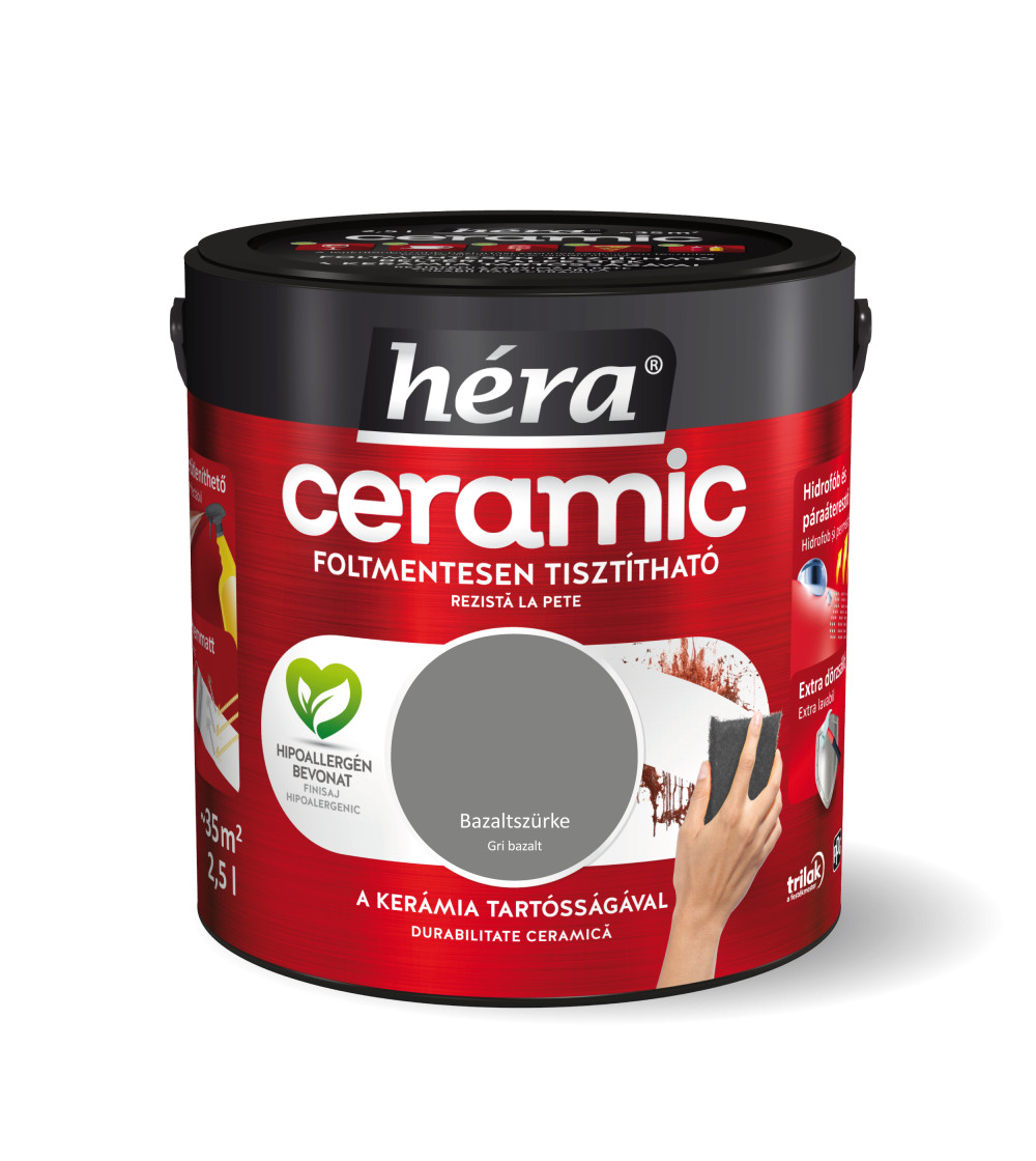A Héra Ceramic speciális mikrokerámia-gyöngy tartalmának köszönhetően a legellenállóbb Héra beltéri falfesték. A kerámia technológia kimagasló mosás- és dörzsállóságot biztosít a felületnek, így téve azt foltmentesen tisztíthatóvá és fertőtleníthetővé. A Héra Ceramic falfesték hidrofób alkotórészei révén vízlepergető bevonatot képez, miközben innovatív kötőanyag szerkezete kiváló páraáteresztő tulajdonságot biztosít. A hipoallergén, selyemmatt felület exkluzív színmegjelenést kölcsönöz otthonának.