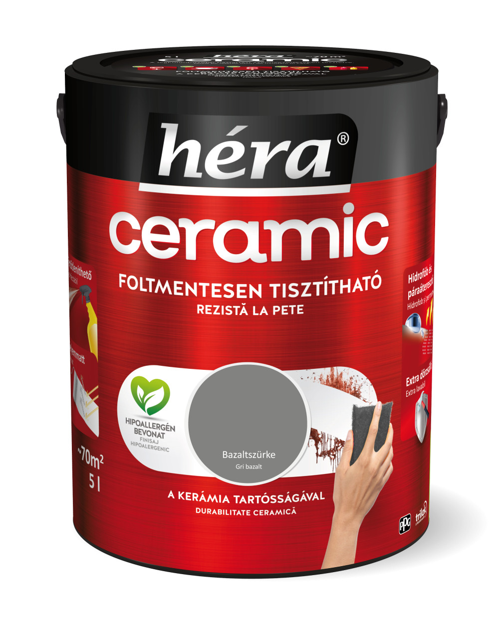 A Héra Ceramic speciális mikrokerámia-gyöngy tartalmának köszönhetően a legellenállóbb Héra beltéri falfesték. A kerámia technológia kimagasló mosás- és dörzsállóságot biztosít a felületnek, így téve azt foltmentesen tisztíthatóvá és fertőtleníthetővé. A Héra Ceramic falfesték hidrofób alkotórészei révén vízlepergető bevonatot képez, miközben innovatív kötőanyag szerkezete kiváló páraáteresztő tulajdonságot biztosít. A hipoallergén, selyemmatt felület exkluzív színmegjelenést kölcsönöz otthonának.
