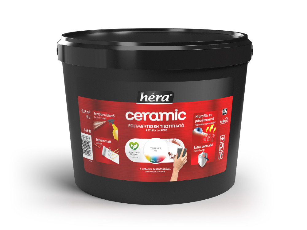 A Héra Ceramic speciális mikrokerámia-gyöngy tartalmának köszönhetően a legellenállóbb Héra beltéri falfesték. A kerámia technológia kimagasló mosás- és dörzsállóságot biztosít a felületnek, így téve azt foltmentesen tisztíthatóvá és fertőtleníthetővé. A Héra Ceramic falfesték hidrofób alkotórészei révén vízlepergető bevonatot képez, miközben innovatív kötőanyag szerkezete kiváló páraáteresztő tulajdonságot biztosít. A hipoallergén, selyemmatt felület exkluzív színmegjelenést kölcsönöz otthonának.