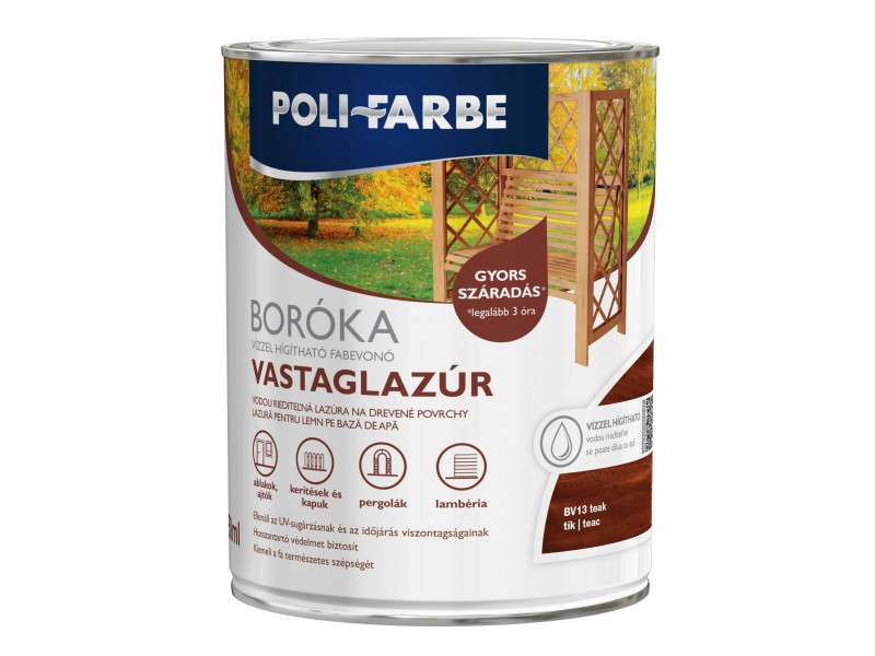 Vízzel hígítható vastaglazúr. Bevonata dekoratív, fényes, az időjárásnak, az UV-sugárzásnak kiválóan ellenáll. A fa természetes légzését nem gátolja, szerkezetét nem fedi el, tartós védelmet biztosít. Kültéren a fa megfelelő védelmét első rétegben Poli-Farbe Boróka Primer fakonzerváló alapozó használata biztosítja.