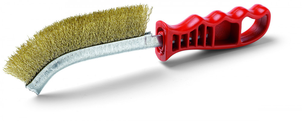 Hajlított, speciális drótkefe rezezett, hullámos acéldrótból, műanyag nyéllel