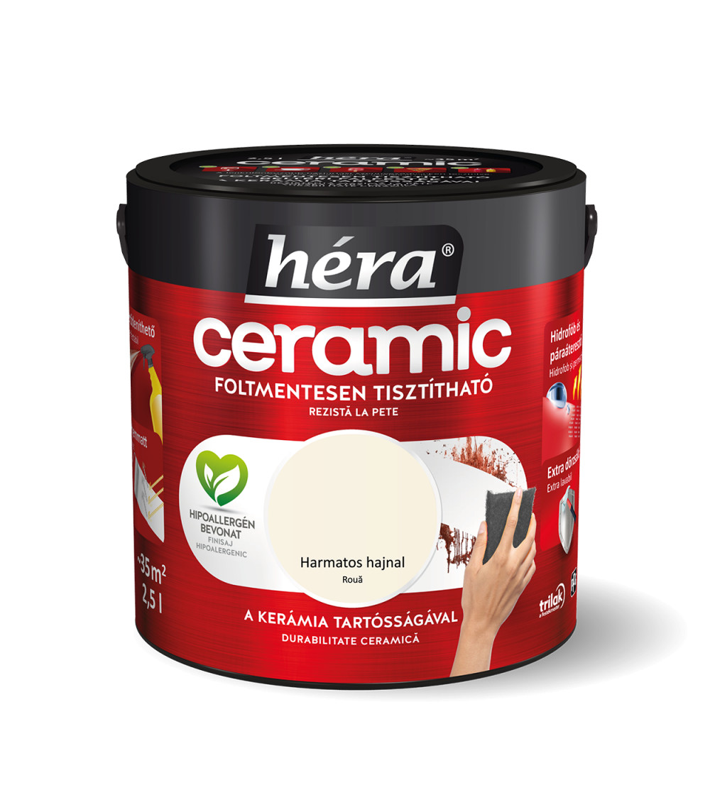 A Héra Ceramic speciális mikrokerámia-gyöngy tartalmának köszönhetően a legellenállóbb Héra beltéri falfesték. A kerámia technológia kimagasló mosás- és dörzsállóságot biztosít a felületnek, így téve azt foltmentesen tisztíthatóvá és fertőtleníthetővé. A Héra Ceramic falfesték hidrofób alkotórészei révén vízlepergető bevonatot képez, miközben innovatív kötőanyag szerkezete kiváló páraáteresztő tulajdonságot biztosít. A hipoallergén, selyemmatt felület exkluzív színmegjelenést kölcsönöz otthonának.